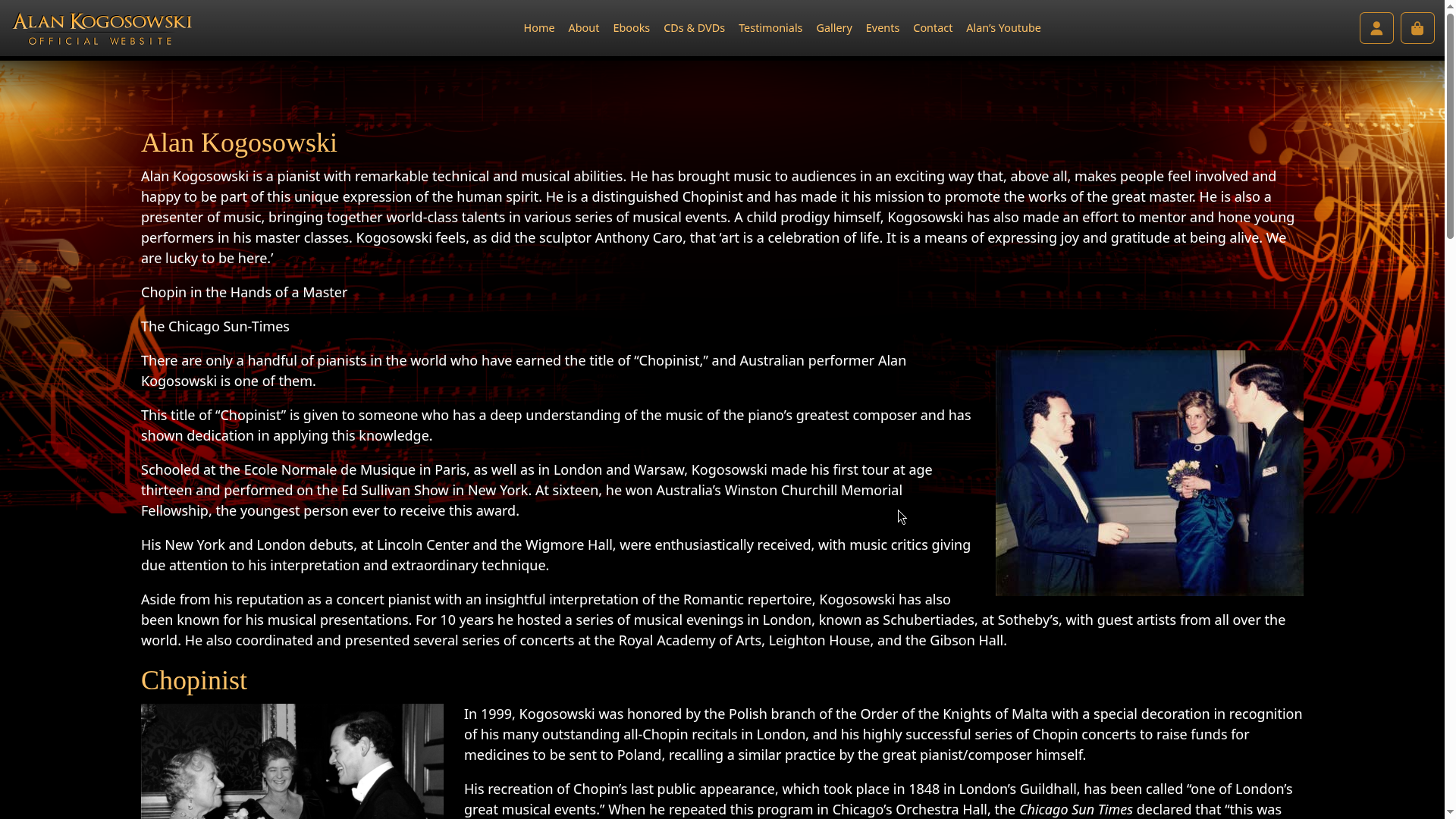 Alan Kogosowski is a pianist with remarkable technical and musical abilities. He has brought music to audiences in an exciting way that, above all, makes people feel involved and happy to be part of this unique expression of the human spirit. He is a distinguished Chopinist and has made it his mission to promote the works of the great master. He is also a presenter of music, bringing together world-class talents in various series of musical events. A child prodigy himself, Kogosowski has also made an effort to mentor and hone young performers in his master classes.